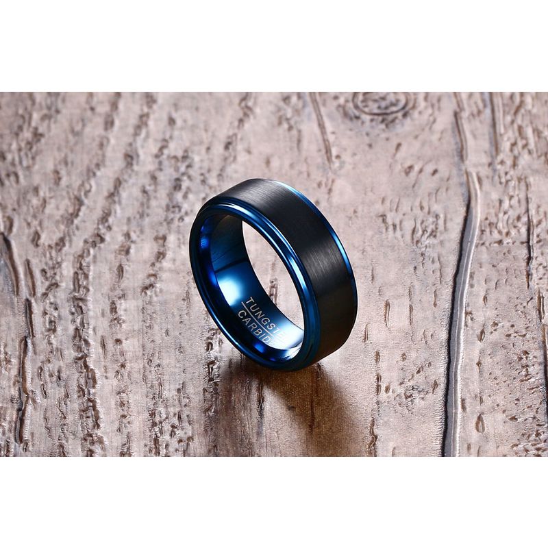 טבעת טוגנסטן שחורה עם פס כחול אולטרה דק משני הצדדים