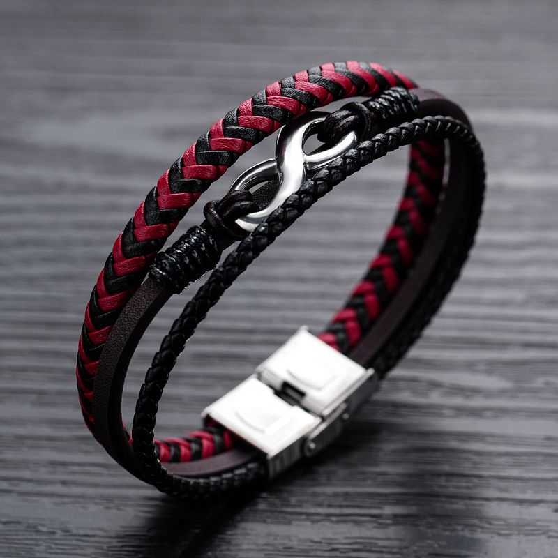 צמיד עור בשילוב צמות שחור אדום ורצועה חומה בתוספת סמל אינפיניטי