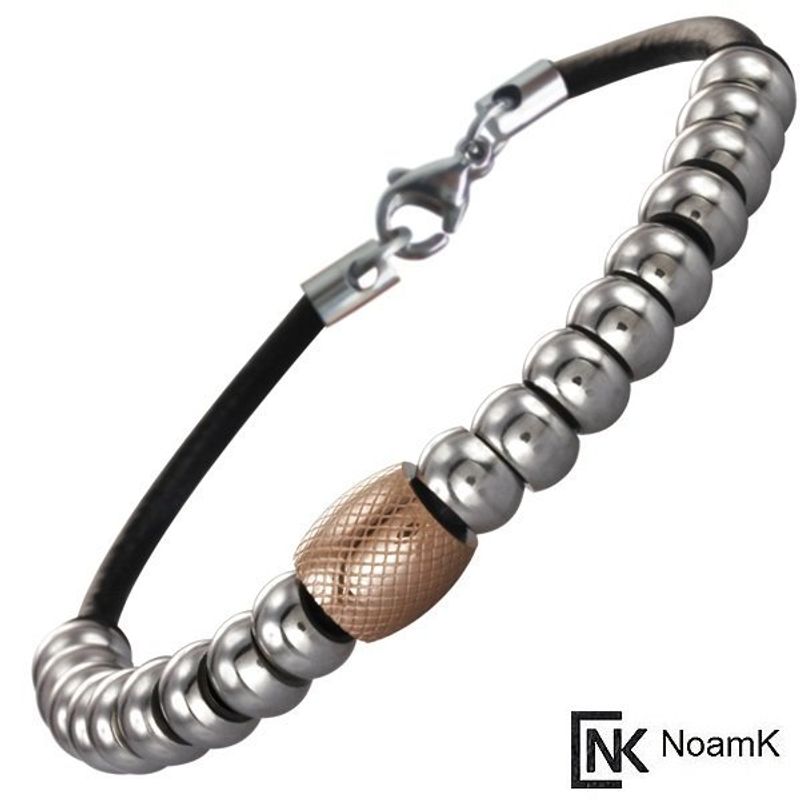 צמיד עור וחרוזי פלדת אל חלד מוזהבים וכסופים