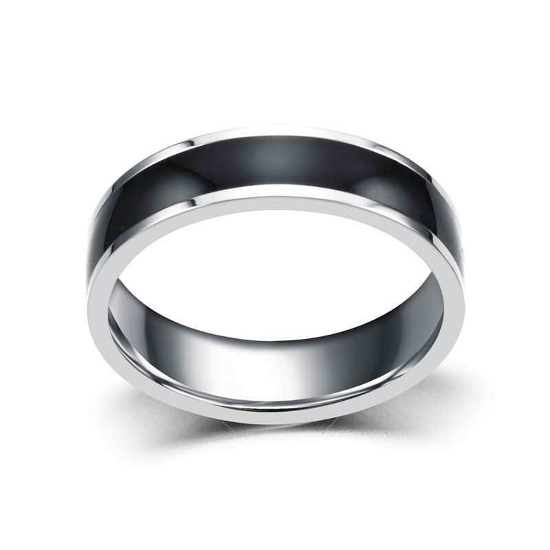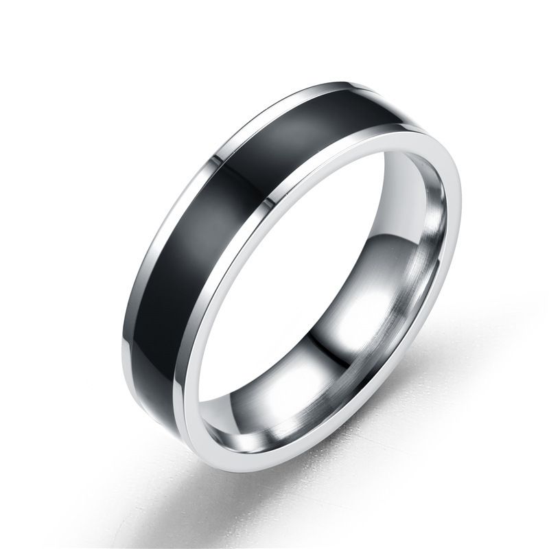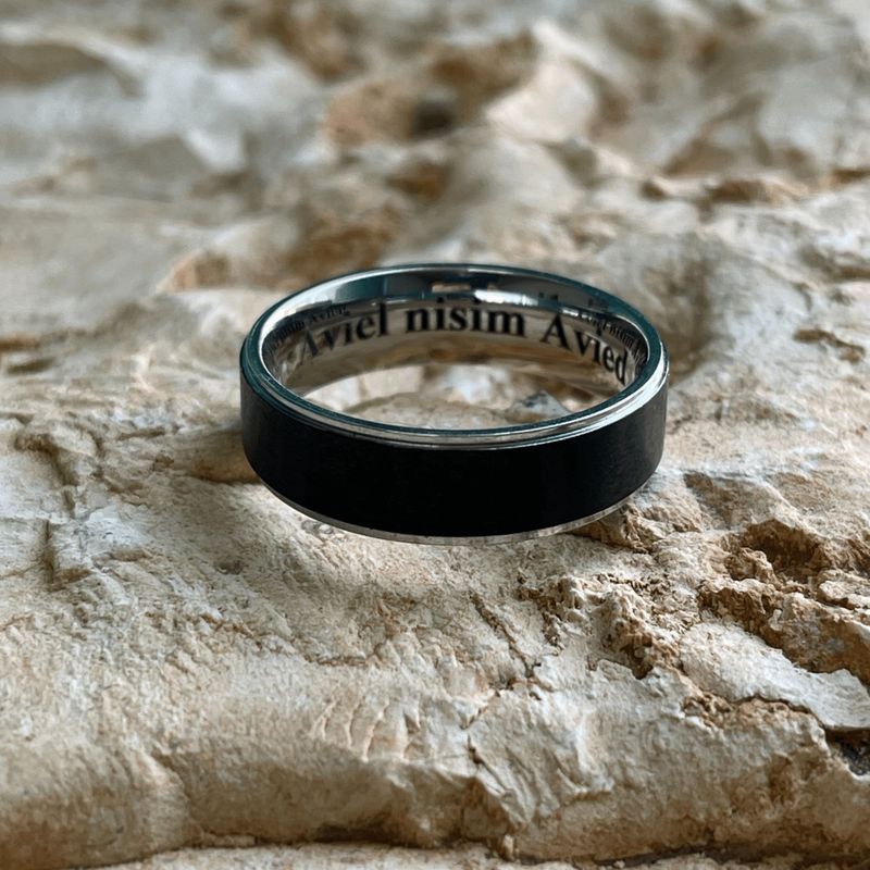 טבעת כסופה עם פס שחור באמצע מפלדת אל חלד לחריטה